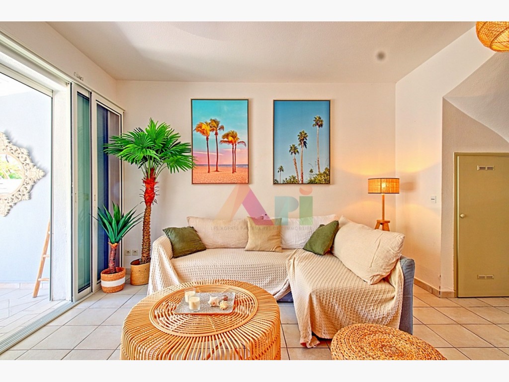 L’extérieur offre une terrasse couverte prolongée par un large deck en bois, aménageable en espace repas et détente, avec un accès direct à la piscine de la copropriété, récemment rénovée.