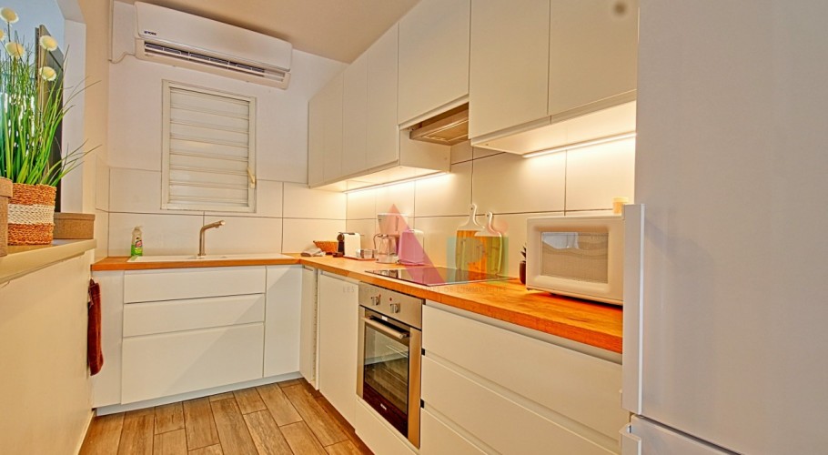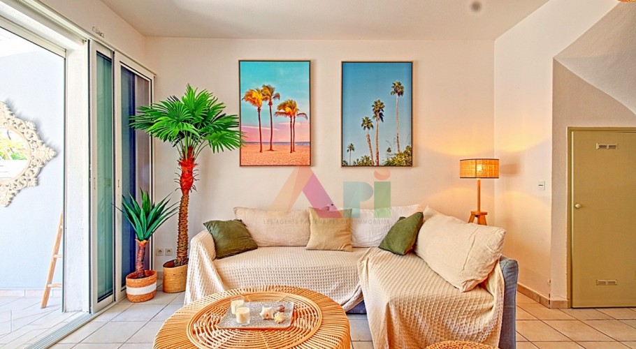 L’extérieur offre une terrasse couverte prolongée par un large deck en bois, aménageable en espace repas et détente, avec un accès direct à la piscine de la copropriété, récemment rénovée.