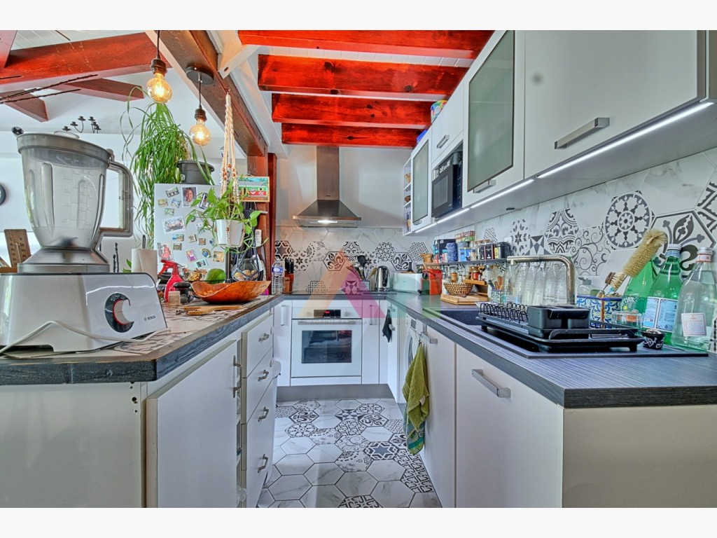 L’appartement se compose d’une cuisine ouverte sur un espace de vie convivial, d’une pièce aveugle avec salle de bain, ainsi que d’une chambre en mezzanine disposant de sa propre salle de bain.