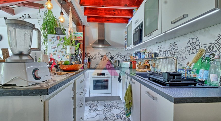 L’appartement se compose d’une cuisine ouverte sur un espace de vie convivial, d’une pièce aveugle avec salle de bain, ainsi que d’une chambre en mezzanine disposant de sa propre salle de bain.